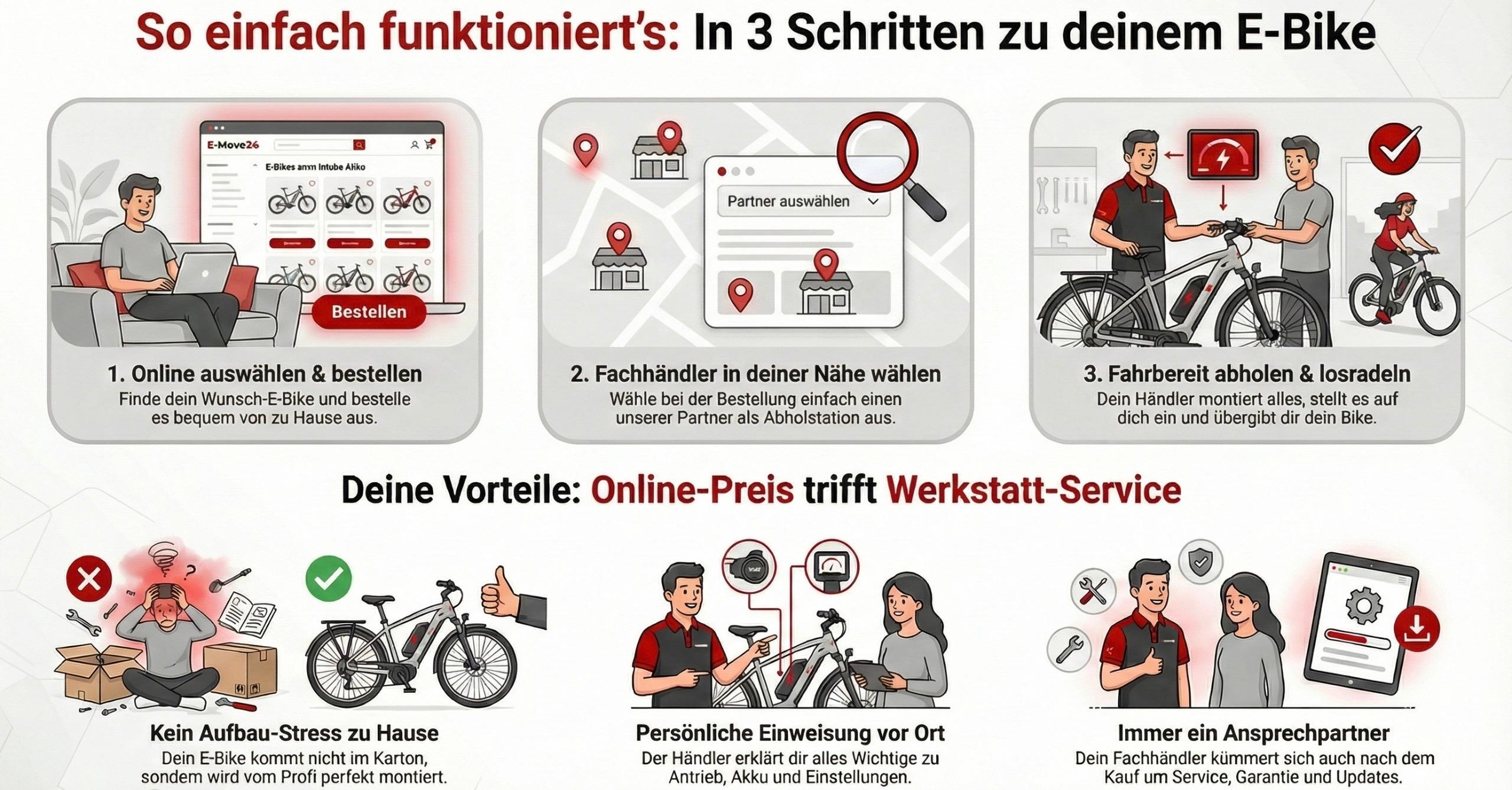 Hinweis zum E-Bike Kauf mit persönlicher ÜbergabeErgänzend zur Wartung und Probefahrt möchten wir Sie darauf hinweisen, dass Sie unsere E-Bikes auch bequem online kaufen und fahrbereit bei einem unserer Fachhändler abholen können. So stellen wir sicher, dass Ihr E-Bike professionell aufgebaut, geprüft und persönlich übergeben wird.